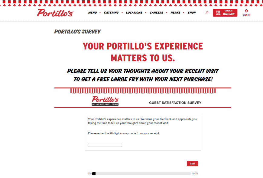 To win free fries from Portillo’s, simply make a purchase and retain the receipt. Then, within 30 days, go online to www.portillos.com/survey and enter the 20 digit survey code on your receipt.